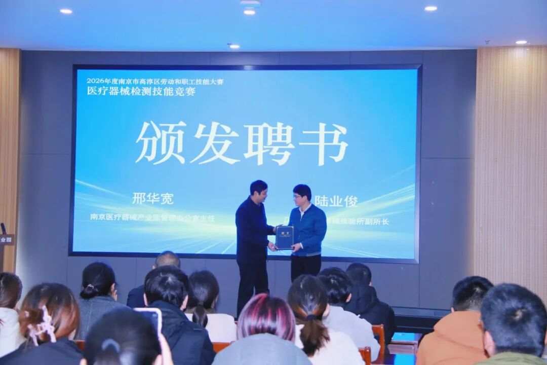 仪式上,南京医疗器械产业园管理办公室主任邢华宽向江苏省医疗器械检验所副所长陆业俊颁发了本次竞赛裁判长聘书,确保赛事专业公平、规范开展。