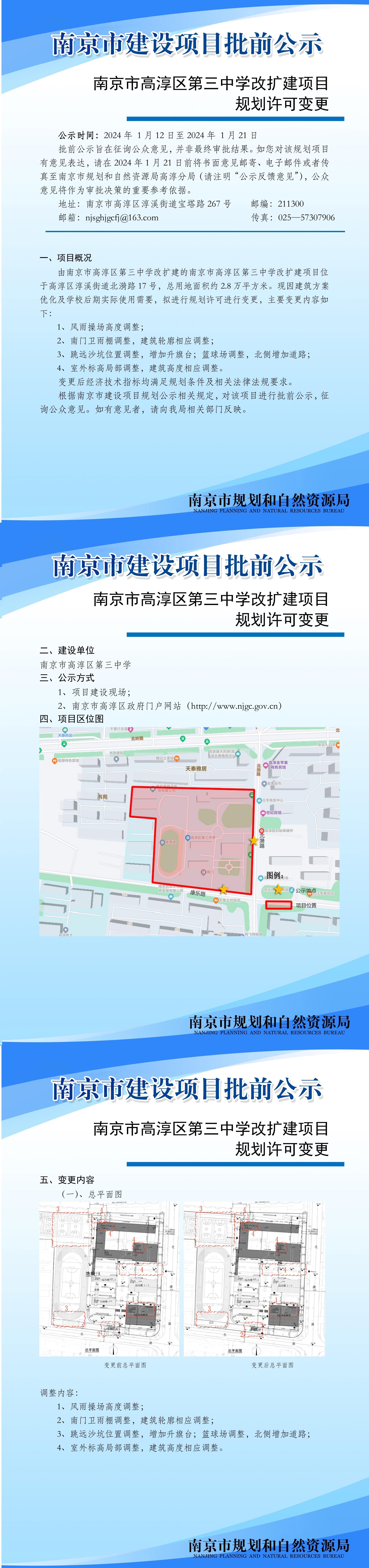 | 信息名称: | 南京市高淳区第三中学改扩建项目规划许可变更批前公示 | ||