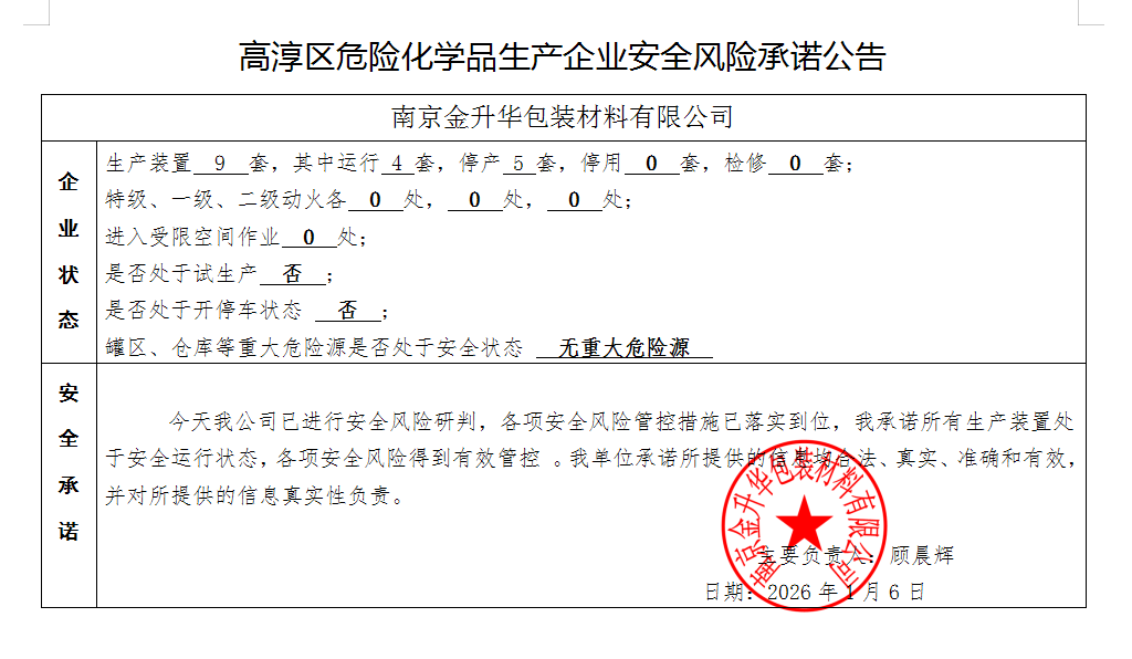 | 信息名称: | 高淳区危险化学品生产企业安全风险承诺公告 | ||