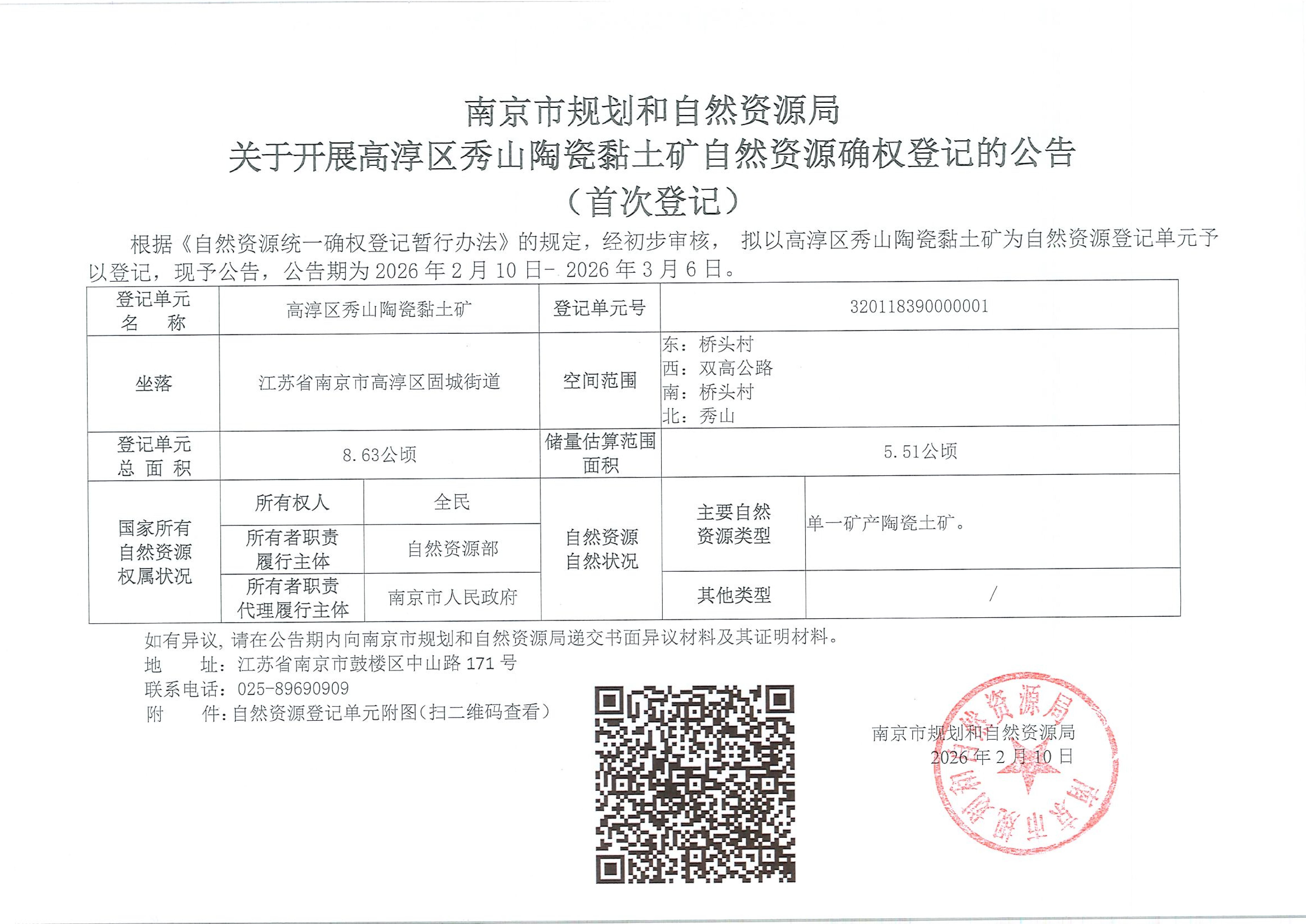 | 信息名称: | 高淳区秀山陶瓷黏土矿确权登记公告 | ||