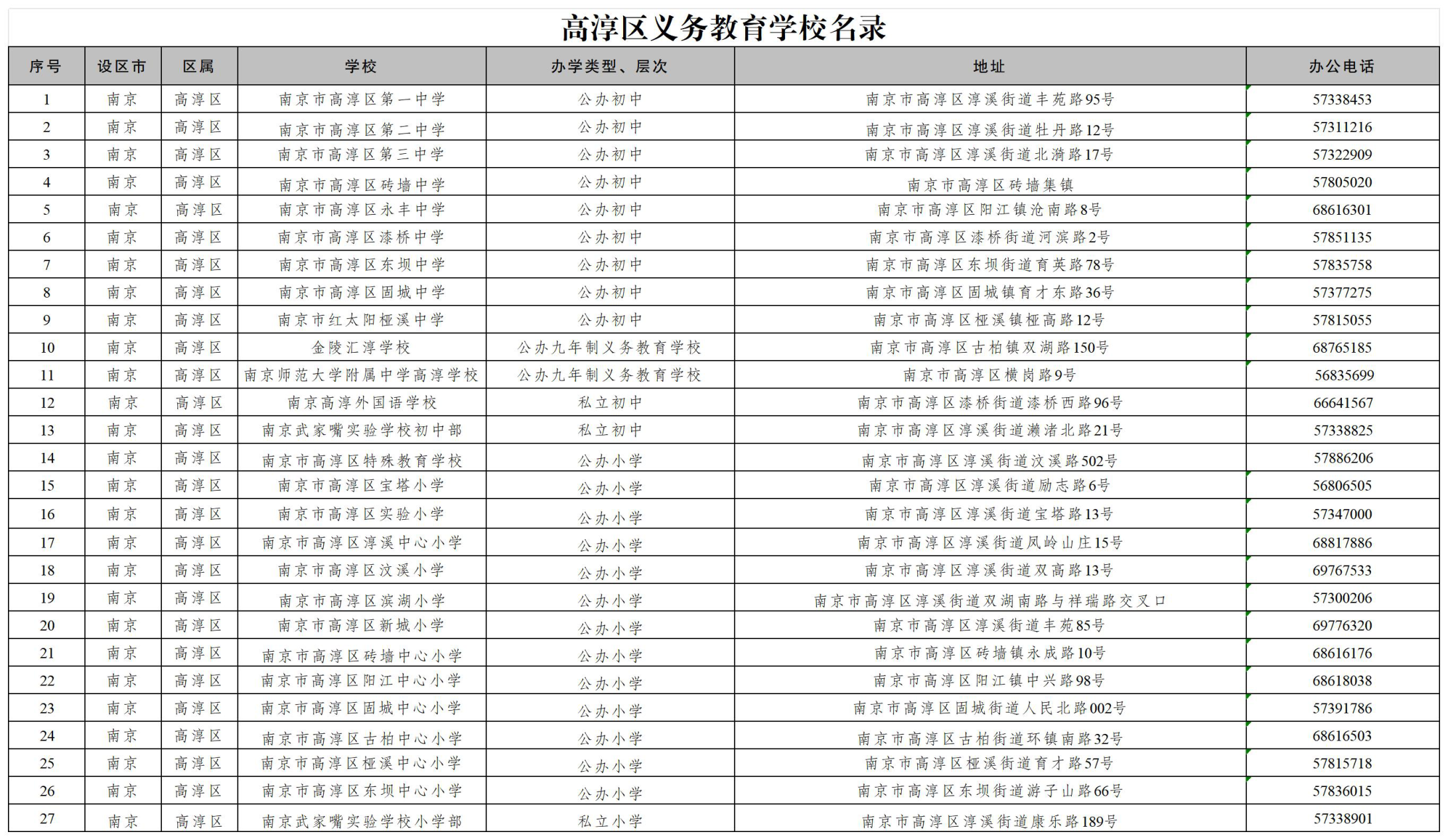 | 信息名称: | 高淳区义务教育学校名录 | ||