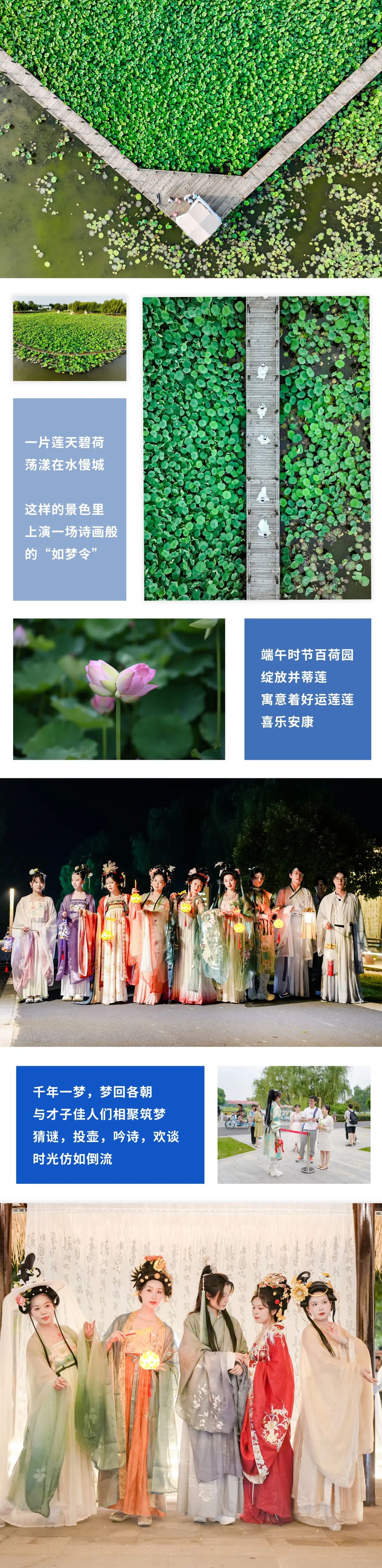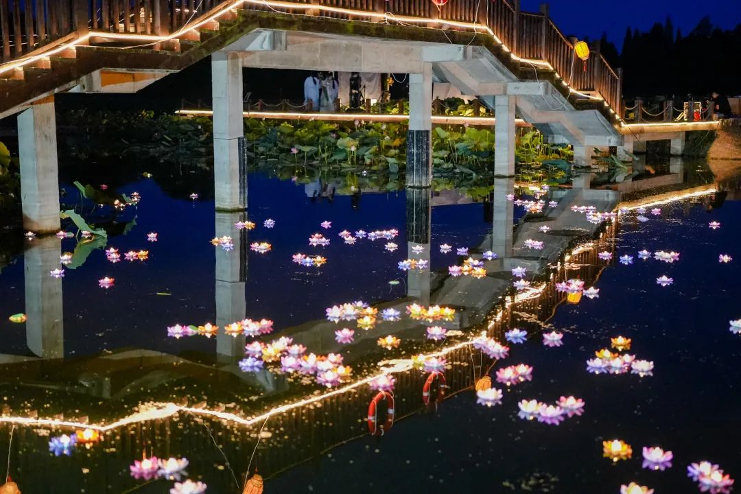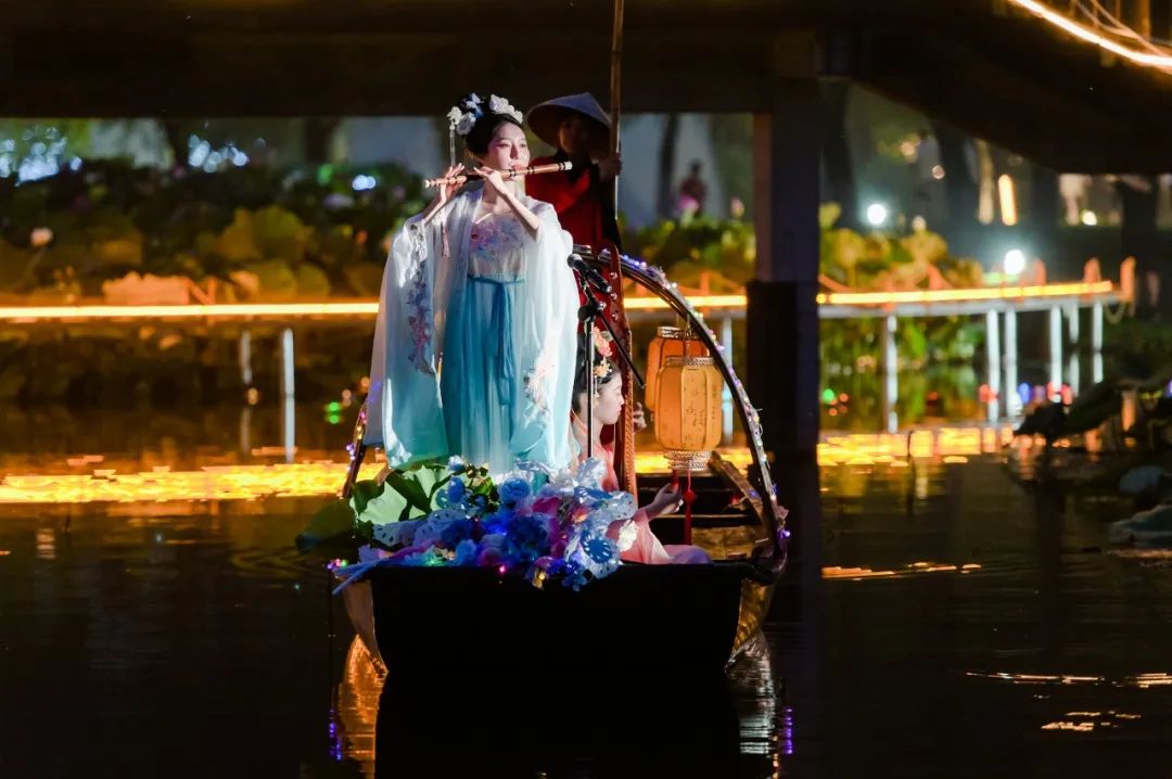 端午夜的水慢城流光溢彩,风吹莲动,舒舞霓裳。“如梦令”——高淳固城湖水慢城荷花旅游节围绕“花神美境&国潮国风”,借宋代著名女词人李清照的一句“误入藕花深处”,将自然荷塘美景与古典文化风韵交织如梦。