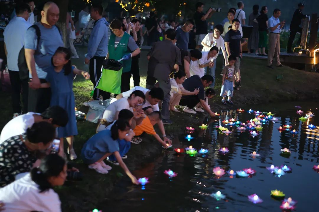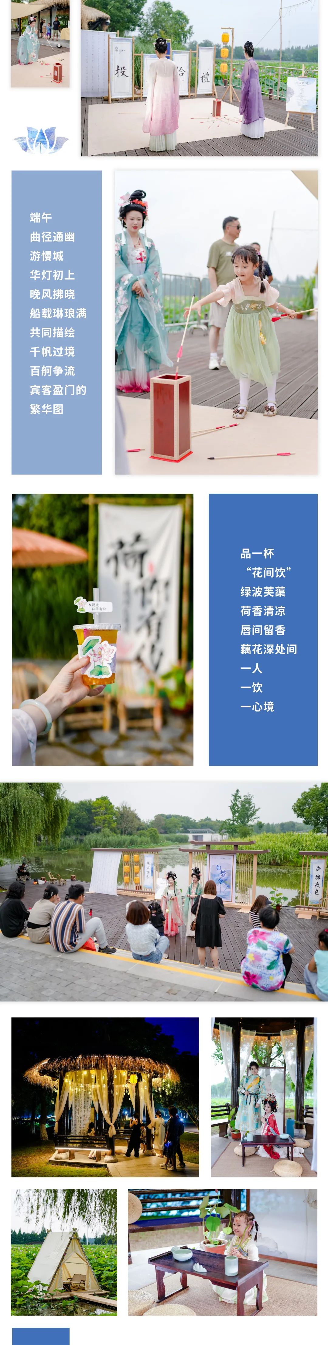 “荷塘夜宴集会”则是承袭了中国古人兰亭集会的雅致与浪漫。期间,集会布有中式风格夜景,集市上有各类饮品、精致点心、夜间小吃等美食随意选择,非遗羽毛扇等本地特色旅游商品,也有南京艺术学院的文创集市,更有猜灯谜、抛绣球、投壶、飞花令、接古诗词等传统互动游戏,让人们亲身参与其中,感受古人的智慧和乐趣。荷塘夜宴集会以简约亲民的方式,给人们带来欢乐和共享传统文化的机会。