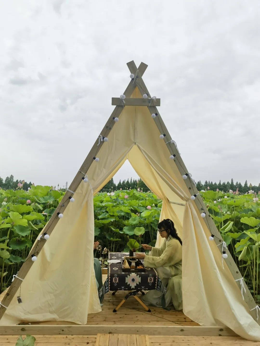 在荷花深处,绿波环绕,荷香弥漫间,再品尝一份别样风情的荷塘下午茶——坐在荷田棚顶的竹筏船或水上帐篷中,随波清扬,尽情享受夏日风光。