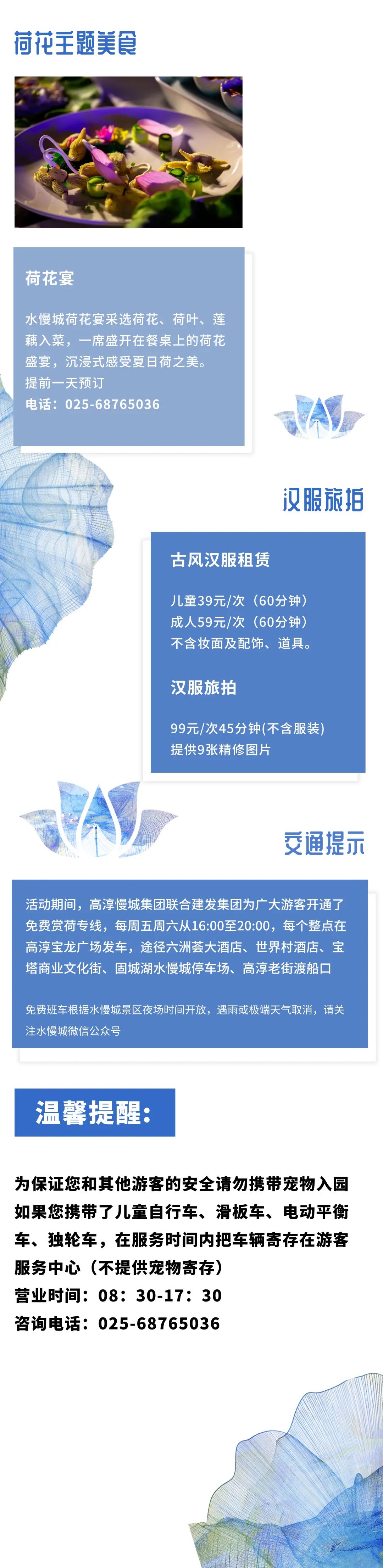 走进百荷园,除了美景,亦有美食。夏季限定荷花宴,将满池荷景融于可口佳肴中,撩动食客的味蕾;闲时饮一杯——绿波芙蕖,品味荷香清凉,或尝一片荷花糕点,让齿颊芬芳。一桌荷花宴就是一种赏花意境,一杯荷花特饮平添了一种赏花心境。