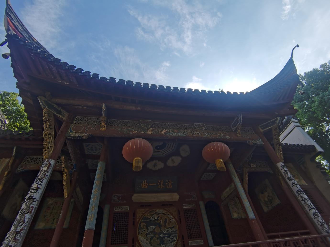 该戏楼建于清、民国及新中国成立后迭经修缮。坐东面西,砖木结构,九檩五柱、穿斗造,屋面形制歇山式。高上下两层,上层演戏,下层供演员住宿。台面3间,通宽15.3米,进深9.46米,高11.2米,占地150平方米。中间正台,两侧子台。正台中用天壁划分前后台。天壁上方悬挂“沧浪一曲”匾额,相传为清代著名文学家方苞所书。天壁两旁设月门出入,扇形门额上分别写“出将”“入相”二字。两侧子台向后缩进,沿口设栅栏,供乐队用。前台台口凸出,角柱上挑出老戗,再由子戗突兀起翘。角柱与梁枋间的斜撑上,雕刻“奔鹿”“仙人”等图案。台顶设方形藻井,彩绘“踏雪访友”“羲之爱鹅”等民间故事,系当地著名画匠孙象勋所作。藻井四周镶配“井”字格平棋天花。两旁角柱悬挂当地名士邢鹤所撰楹联:“功名富贵一时事”;“离合悲欢千古情”;“上台总有下台日,得意须防失意时”。屋顶正脊偏高,配脊略低。高耸的脊梁采用砖砌镂空“喜”“寿”字装饰。正脊两侧山墙装置搏风,配脊砌马头墙。主体突出,层次分明。建筑风格以地方建筑艺术为基调,兼有苏浙楼台特色。