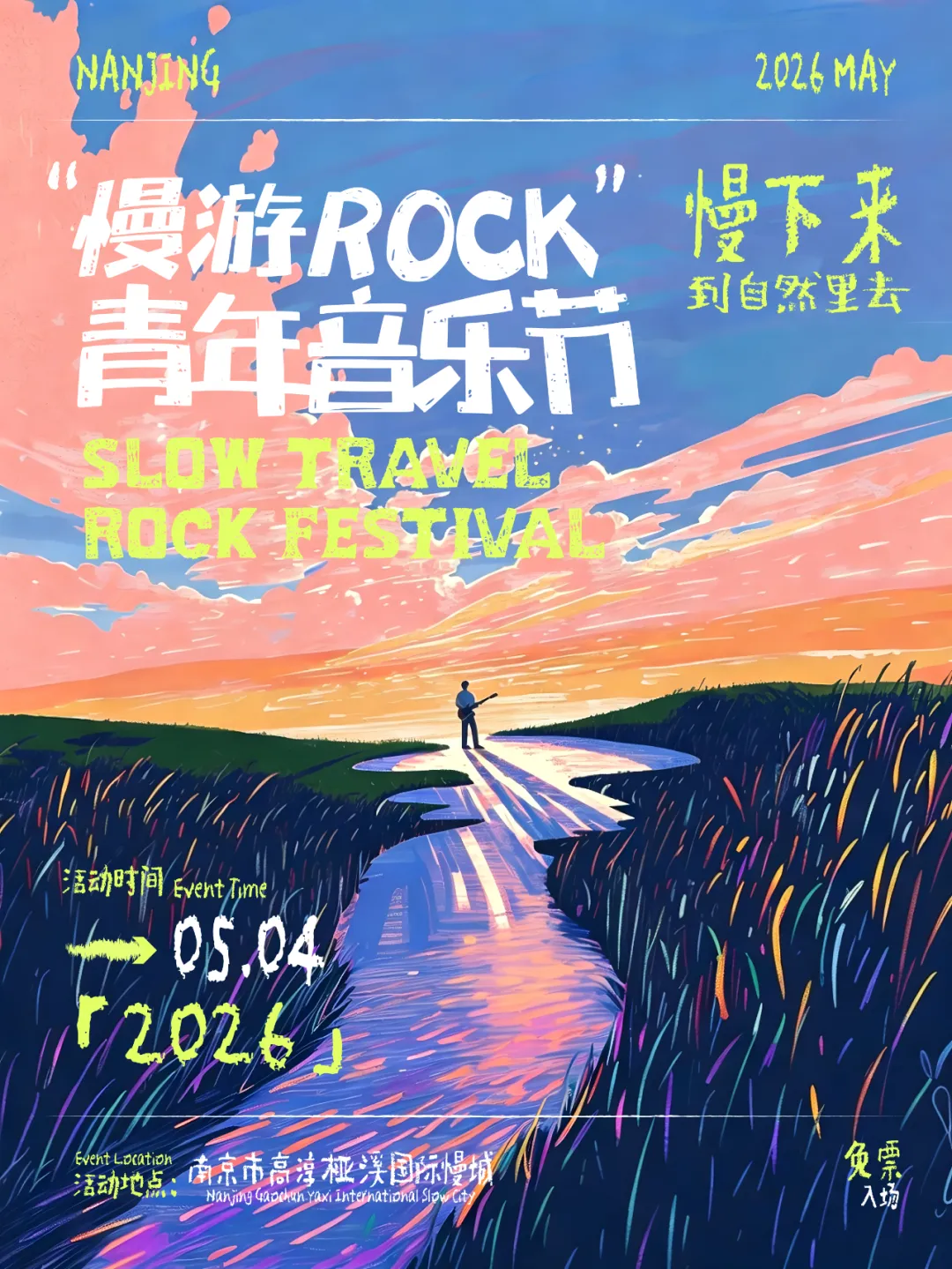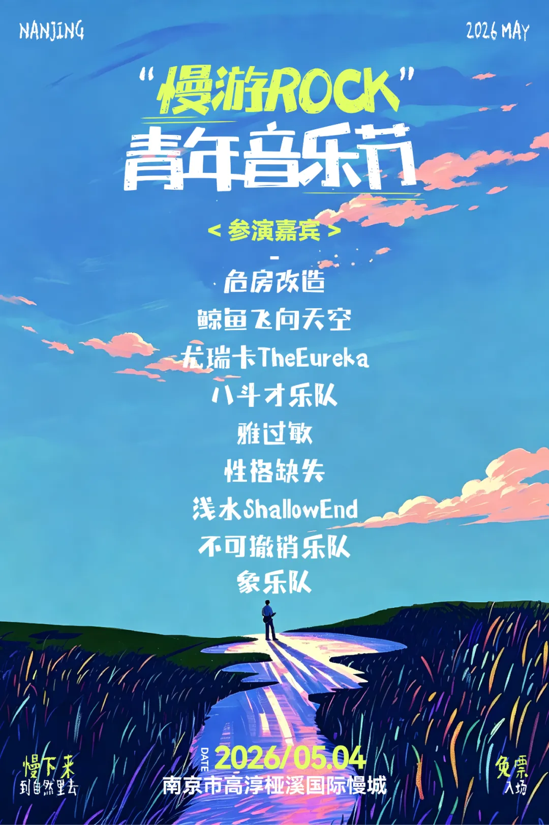 2026 南京慢游 ROCK 青年音乐节正式定档5月4日。本次音乐节最大亮点是全程免票,打破传统音乐节门票壁垒,让所有音乐爱好者都能轻松参与。活动创新采用乐迷投票选乐队的共创形式,经大众票选选出9支宝藏乐队,包括:不可撤销、性格缺失、浅水 ShallowEnd、尤瑞卡 TheEureka、八斗才乐队、雅过敏、鲸鱼飞向天空、危房改造、象乐队,用实力舞台带来极致现场体验。