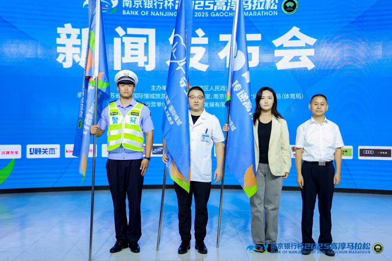高淳区政府副区长魏双林为2025高淳马拉松保障团队代表授旗