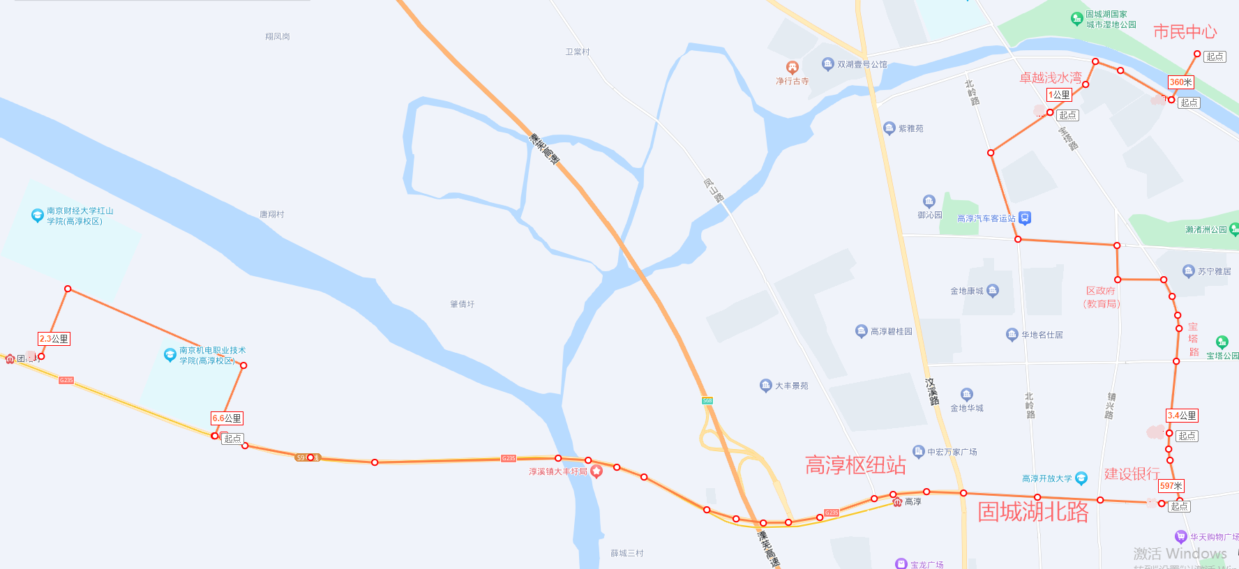 (2)线路走向:市民中心—浅水湾东—财智广场东—万福城—公交车站—长途车站—卫健委—区政府(教育局)—吴家—宝塔公园—凯金广场—狮子山—建设银行—水务局(八佰伴)—老鸭窠—红太阳广场—华地嘉园—高淳枢纽站(增设站点)—临城路口—机电职业技术学院南—机电职业技术学院东—南京财经大学红山学院西—恒心路与宁高新通道交叉口(团结圩站南)