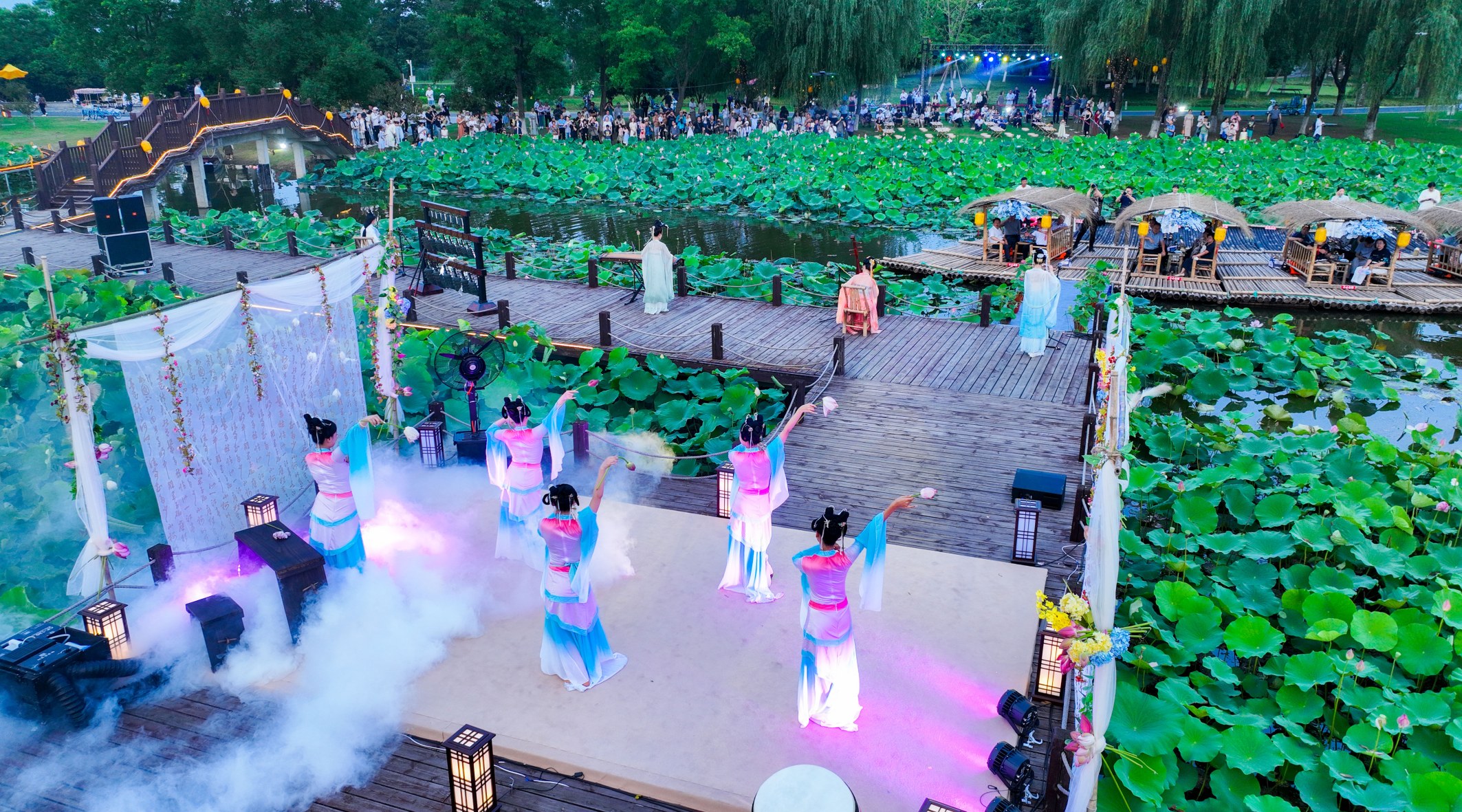 固城湖水慢城作为荷花节的主会场,水面荷花面积近千亩,拥有荷花品种近百种,花期从6月持续至8月,每年都会吸引众多游客慕名前来。“趁着端午假期,带着孩子过来游玩。不仅有好听好看的音乐剧,还有琳琅满目的美食,风景也很美,吹着夜晚的凉风,真的很惬意。”市民霍晓虹说。