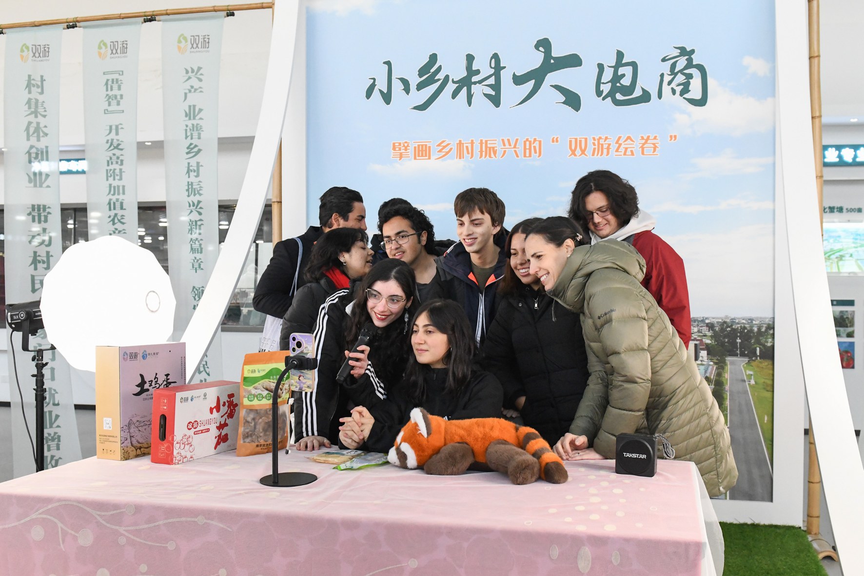 调研首站来到双游村农创园。在这里,智利青年们沉浸式体验了从农产品孵化、电商直播到品牌推广的全链条现代农业运营模式。“这完全不同于我们熟悉的模式,非常新颖。”智利支队成员Maribel Florez在参观后感慨,社区与电子商务的深度结合,为减贫提供了全新的思路。