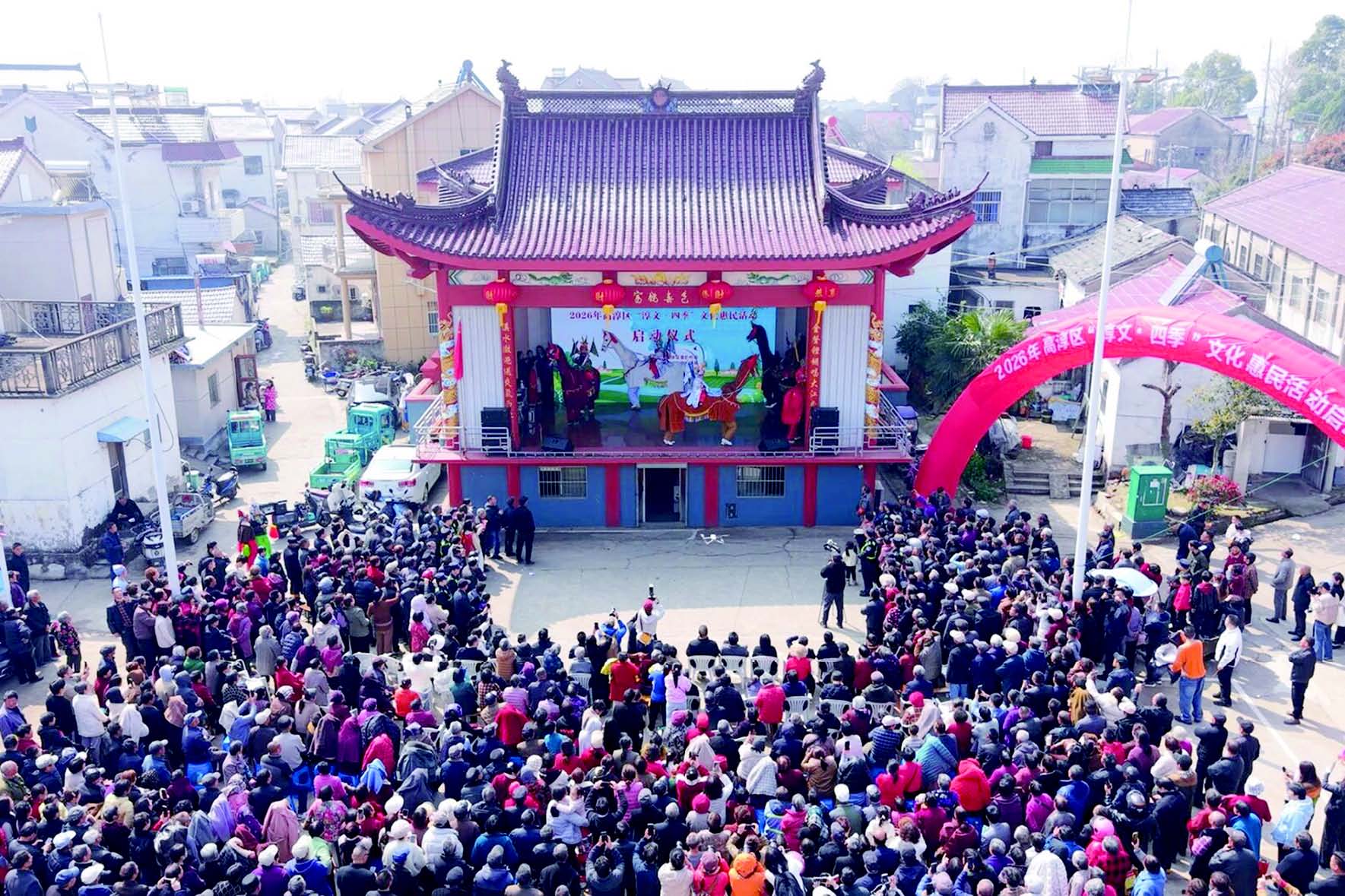 仪式现场发布两大重磅内容,为高淳群众解锁全年文化惊喜。2026年高淳区“淳文·四季”百项重点群文活动以四季为脉络,精心打造春日读书季、暑期青春季等四大主题板块,真正实现“季季有主题、月月有活动、场场都精彩”,让文化惠民贯穿全年、覆盖全域;“跟着戏台读高淳”特色研学线路,则串联起辖区九座古戏台,带领游客与市民在行走漫步中,深度品读高淳厚重的人文底蕴与乡土故事。